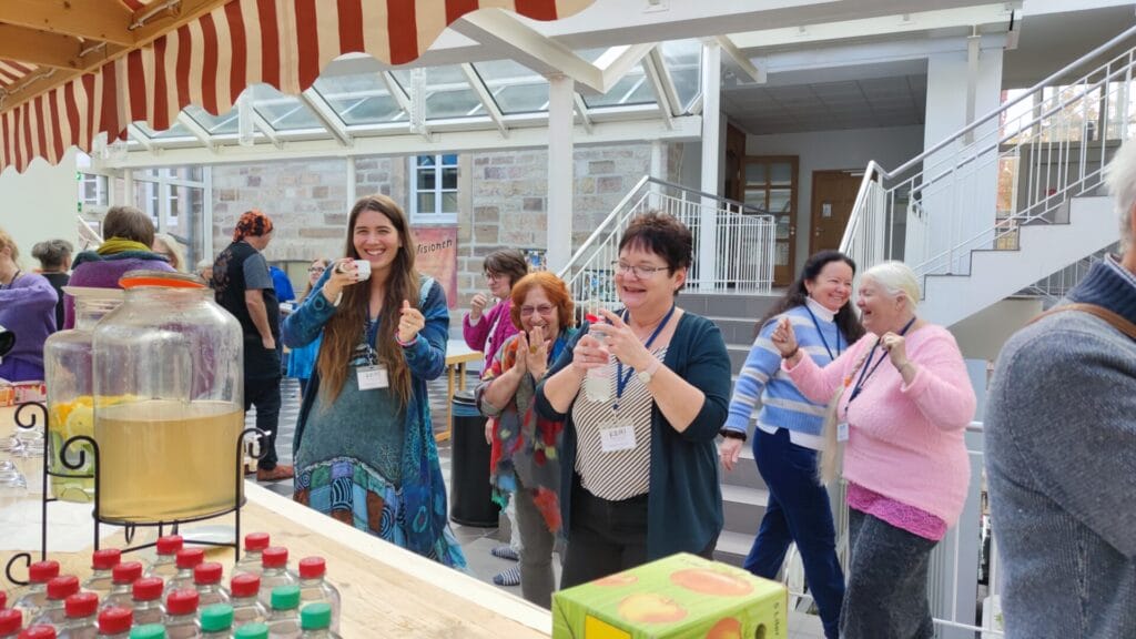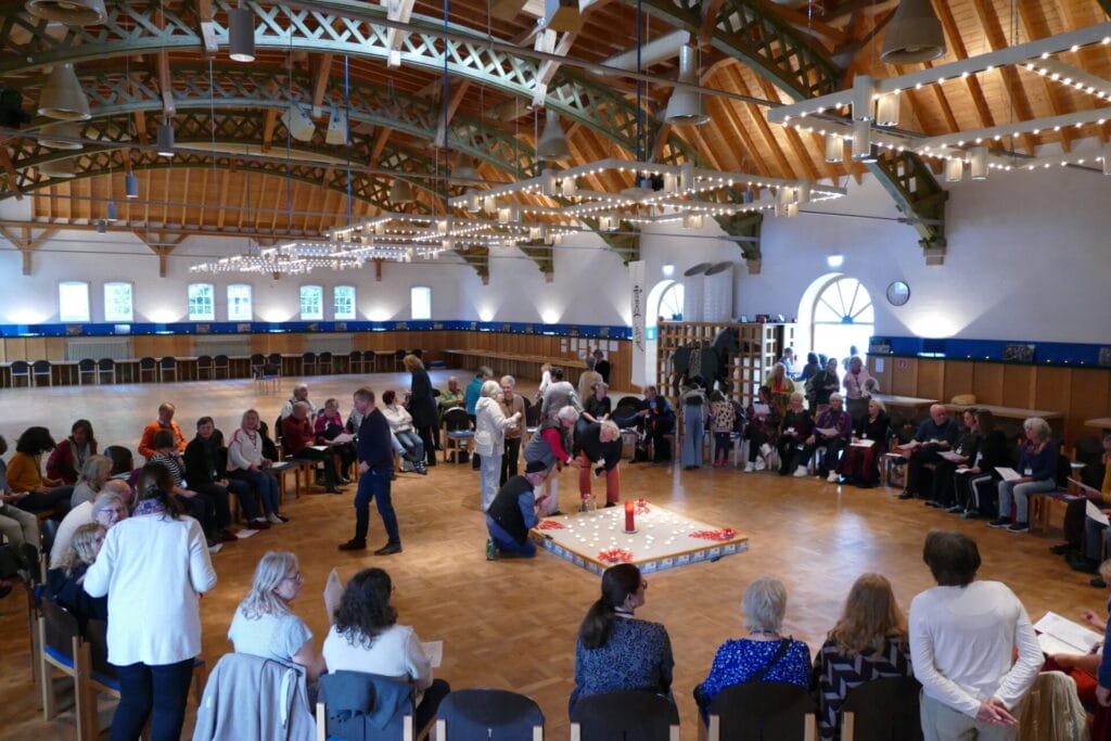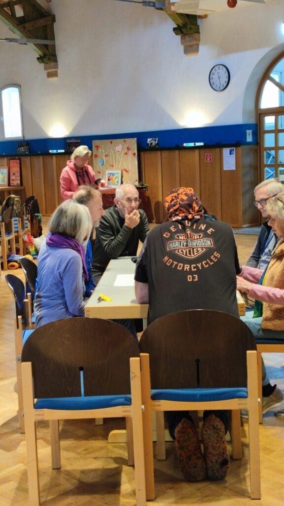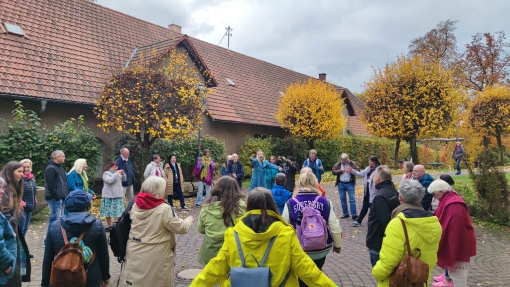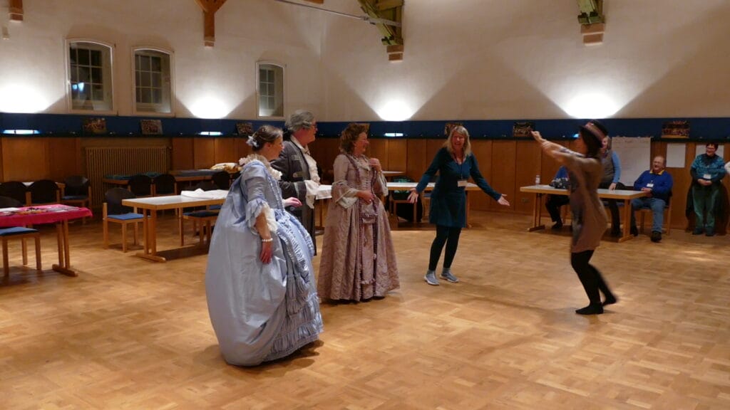 Nach der Vorstellungsrunde und dem Friedenstanz war Zeit für den Reiki-Austausch und am Abend, nach dem Abendessen wurden wir auf dem Marktplatz von Hans und Brigitte Trumpf überrascht, die mit einem anderen Paar in Barock-Kleidung zwei Menuett-Tänze aufführten.
